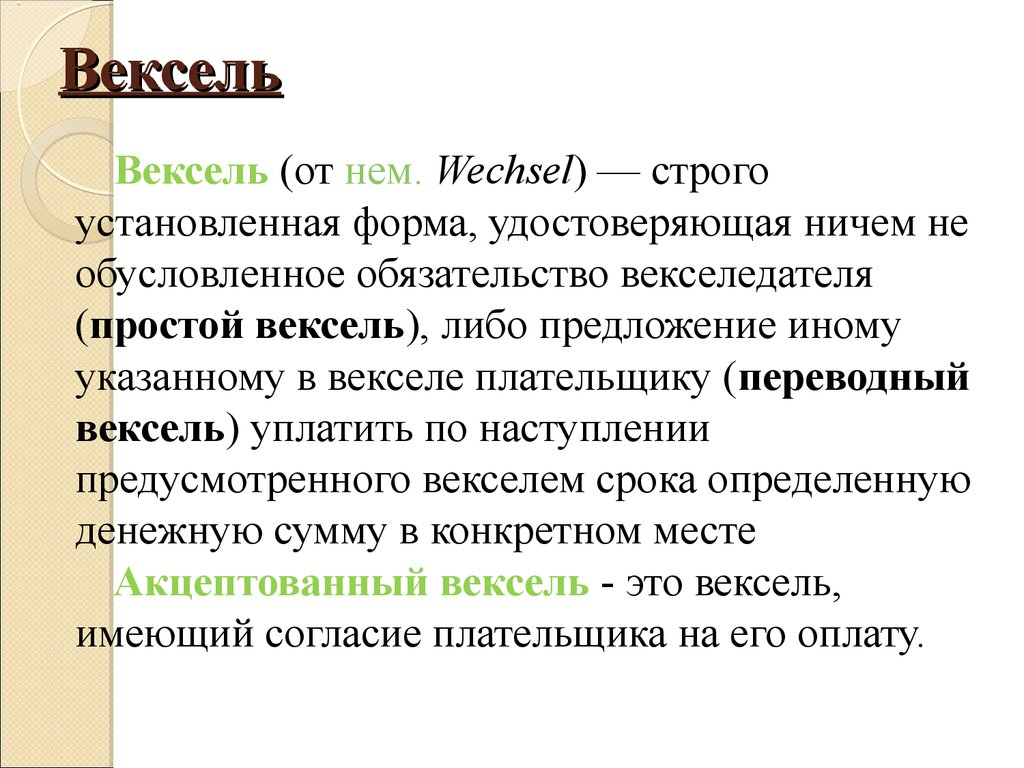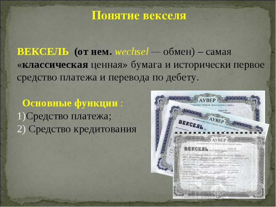 Векселя, срок действия которых превышает девять месяцев и/или которые предоставляют кредитору проценты в компании, с гораздо большей вероятностью будут классифицироваться как ценные бумаги.