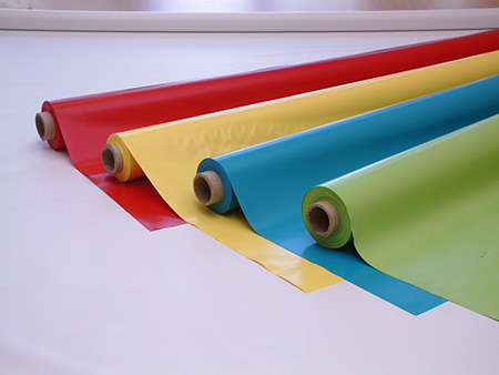 - Окрашенные, не прозрачные пленки и с теснением – применяются в канцелярии для обложек тетрадей и папок, автомобильной промышленности, строительстве (бассейны и натяжные потолки), производстве надувных игрушек и матрацев, самоклеящихся материалов для этикетки и уличных баннеров.