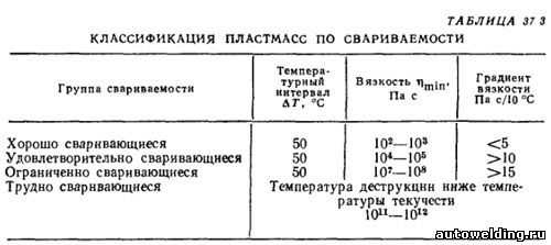 По свариваемости все термопластичные пластмассы можно разбить по этим показателям на четыре группы (табл. 37.3).