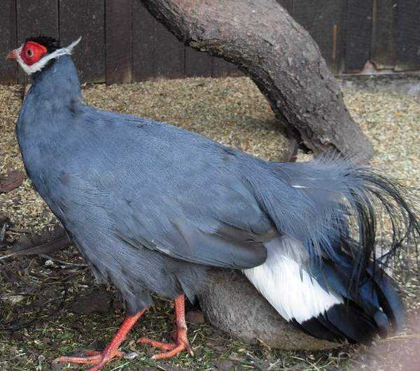 Ноги длинные, розовые, у самцов со шпорами. Хвост пышный, разных оттенков синего и черного, нижние перья у его основания – белоснежные.