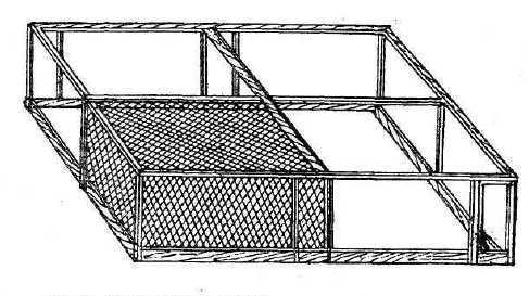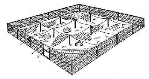 Изображение 3. Схема крытого садового вольера - Строительство вольеров. Перед строительством вольера стоит определиться с породой разводимой птицы. Так, мясные породы фазанов не столь прихотливы в организации личного пространства, и чувствуют себя вполне неплохо даже в маленьких вольерах или небольших клетках. А вот фазаны, разводимые для участия в охоте, требуют куда большего пространства – стоит исходить из цифры 2 кв. метра на особь. В весенний же период площадь личного пространства охотничьего фазана возрастает до 12 кв. м. Так что, вольеры должны быть просторными, где птицы могут быстро передвигаться и летать. Кроме основного вольера, следует оборудовать и несколько небольших – для содержания молодых особей. Существует несколько основных видов вольеров: