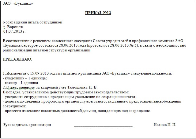 Главное, что в любом случае должно в нем содержаться – это название компании, личные данные увольняемого, причина увольнения (по ТК РФ), подпись директора (или уполномоченного на это лица) и подпись сотрудника.