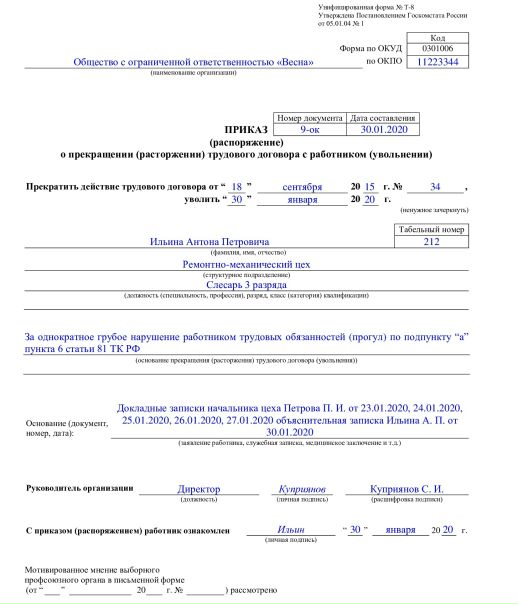 Кто составляет приказ об увольнении по форме Т-8