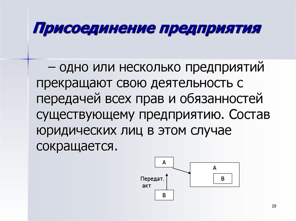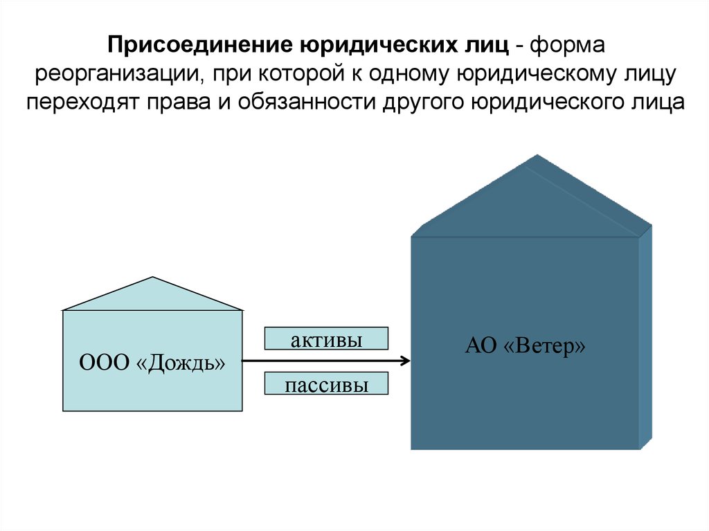 Присоединения. Этот вариант реорганизации компании «А» (предприятия) воплощается в жизнь посредством обычного присоединения реорганизуемого предприятия к другой организации «Б». При этом создание нового юридического лица не предусмотрено. После завершения присоединения все имеющиеся обязательства компании «А» и её права переходят к компании «Б». При этом операция считается полностью завершённой, начиная со дня совершения записи о произошедшей реорганизации в ЕГРЮЛ.