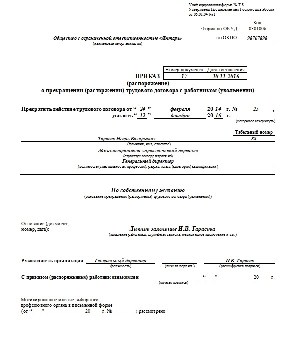 С предыдущим руководителем трудовой договор расторгается по основаниям, предусмотренным ТК РФ, и оформляется общехозяйственный приказ о снятии полномочий, а также кадровый приказ об увольнении.