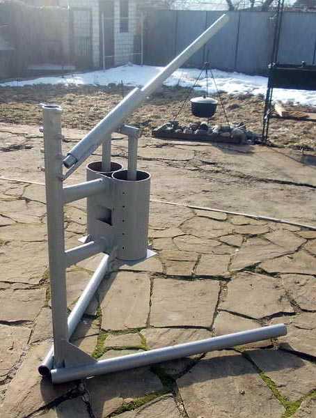 Первый вариант самый простой. Из металлической профильной трубы на сварке выполняется рама, которая для удобства может прикрепляться к стене дома или сарая. В нижней части рамы неподвижно устанавливается форма круглой или прямоугольной конфигурации, а сверху на шарнире крепится длинный рычаг. К нему присоединяется нажимной элемент, входящий внутрь формы с небольшим зазором.