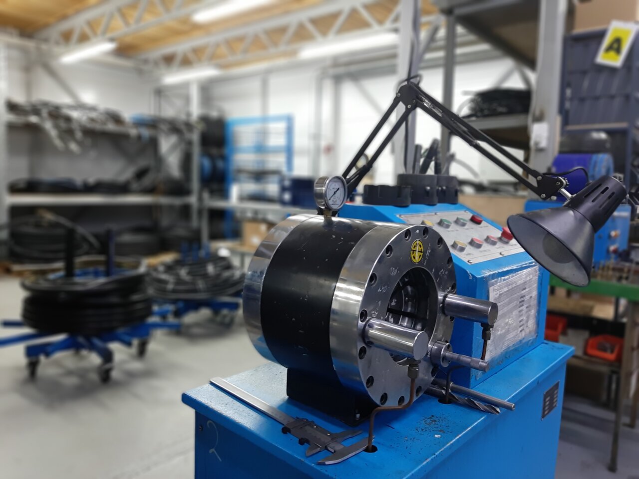 - Дополнительное оборудование, без которого не обойтись в цехе: станина для пресса, роллы для разматывания бухт со шлангами, приспособление для смены кулачков, испытательный стенд высокого давления.