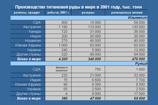 Почти 170 тыс. тонн титановых руд и концентратов на наши предприятия поставляла Украина, ещё 38,7 тыс. тонн — Вьетнам, меньше 2 тыс. тонн приходилось на прочие страны. Ильменитовые концентраты украинских месторождений считаются (или считались) лучшим сырьём для переработки сульфатным способом.