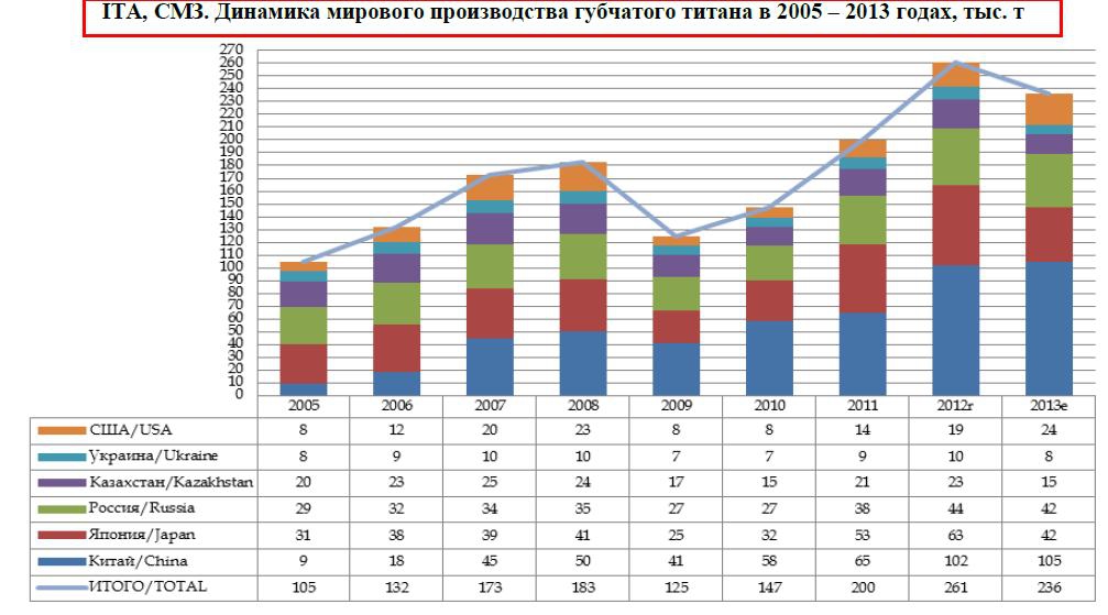 При этом в стране было произведено 65 тыс. тонн титанового пигмента (из импортного сырья на мощностях «Крымского титана») и 30 тыс. тонн губчатого титана (в основном из импортного сырья и в небольшом количестве из отечественного лопаритового концентрата).