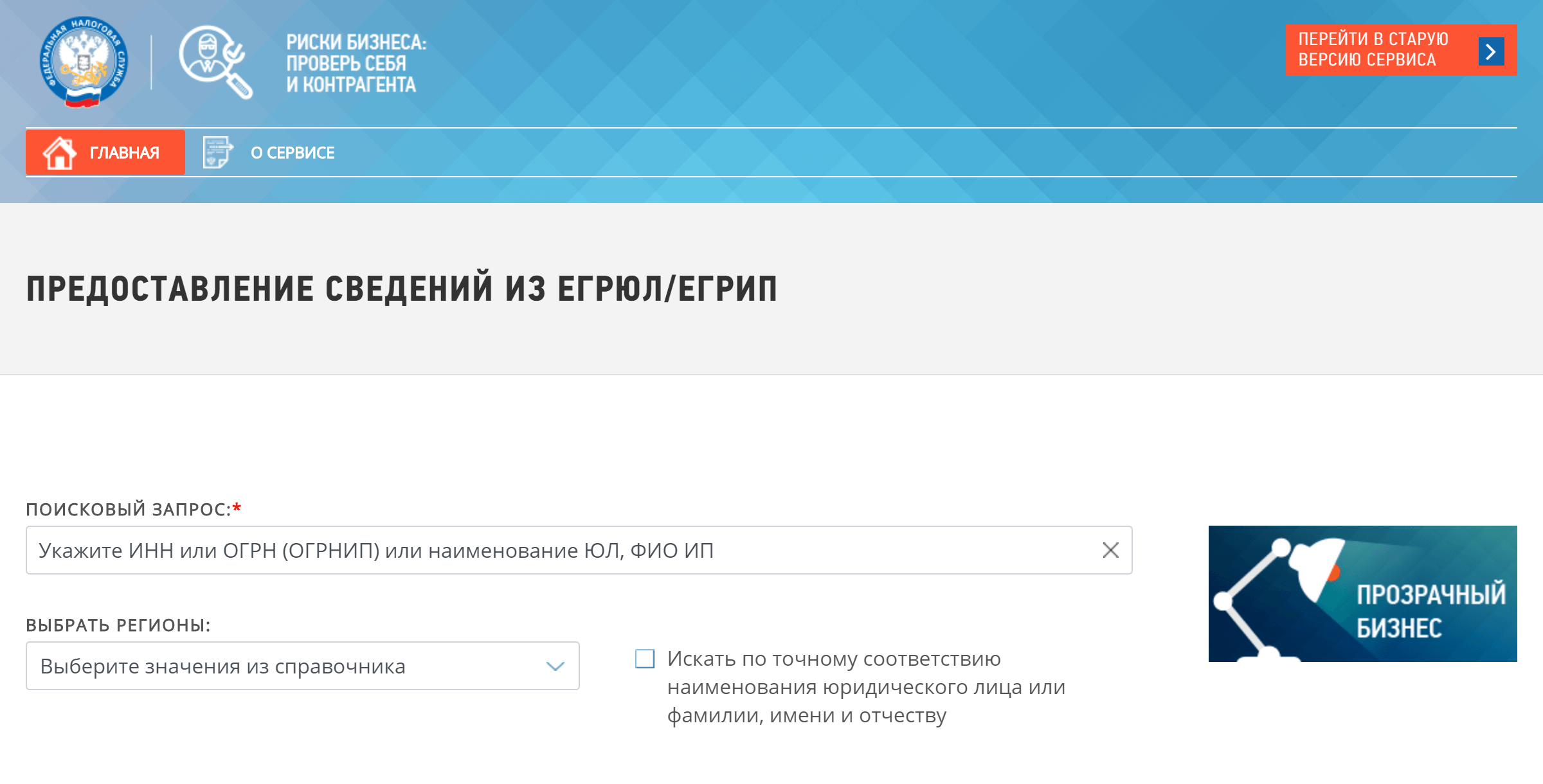 В поиске вводится известная информация о компании или физическом лице: ИНН, ОГРН, название, ФИО или адрес. Лучше использовать ИНН или ОГРН, иначе выборка может оказаться слишком большой.