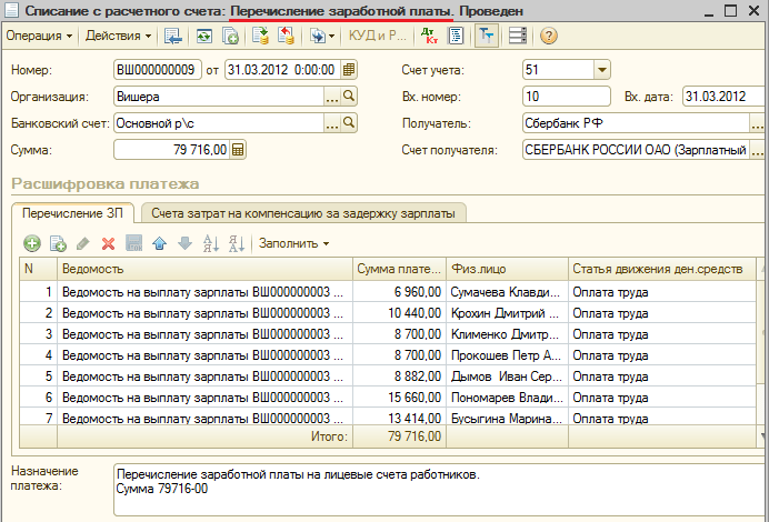 1 | 70 | 51 | Перечислена заработная плата с расчетного счета организации на карточки работников |