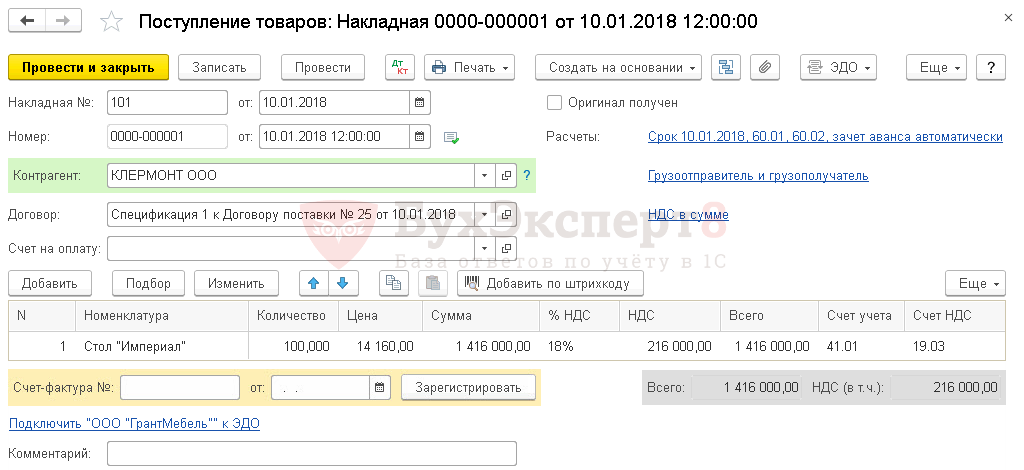 Поступление товаров и услуг в меню «Покупка» вид хозяйственной операции: «Покупка, комиссия»