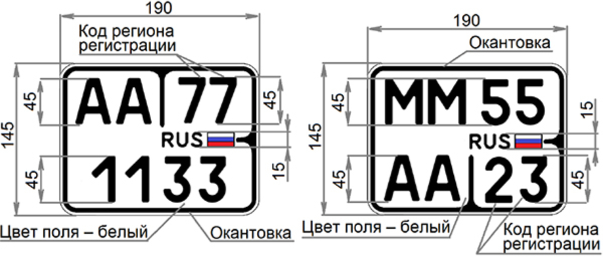 2) Новый номер для мотоциклов. Действующий стандарт — 245 на 160 мм, новый — 190 на 145 мм. Изменение размера должно решить проблему установки номеров на зарубежные модели мотоциклов: у них, как правило, небольшая площадка под госзнак, российские номера на них плохо держатся, их может сорвать на ветру. Приходится использовать самопальные переходники.