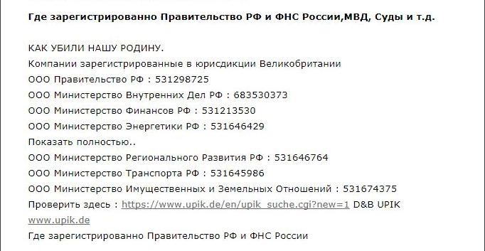 Однако, указывает Олег, Российская Федерация как юридическое лицо существует: «Это иностранная управляющая компания, зарегистрированная в мировом реестре юридических лиц на сайте https://www. upik.de/en/ как коммерческая организация под серийным номером D-U-N-S© 531298725, директором которой является гражданин СССР Дмитрий Анатольевич Медведев. Ряд министерств и ведомств также имеют иностранную регистрацию в этой же юрисдикции. Следовательно, все налоговые отчисления и страховые взносы идут не на развитие нашей советской Родины, а уходят прямиком за границу».