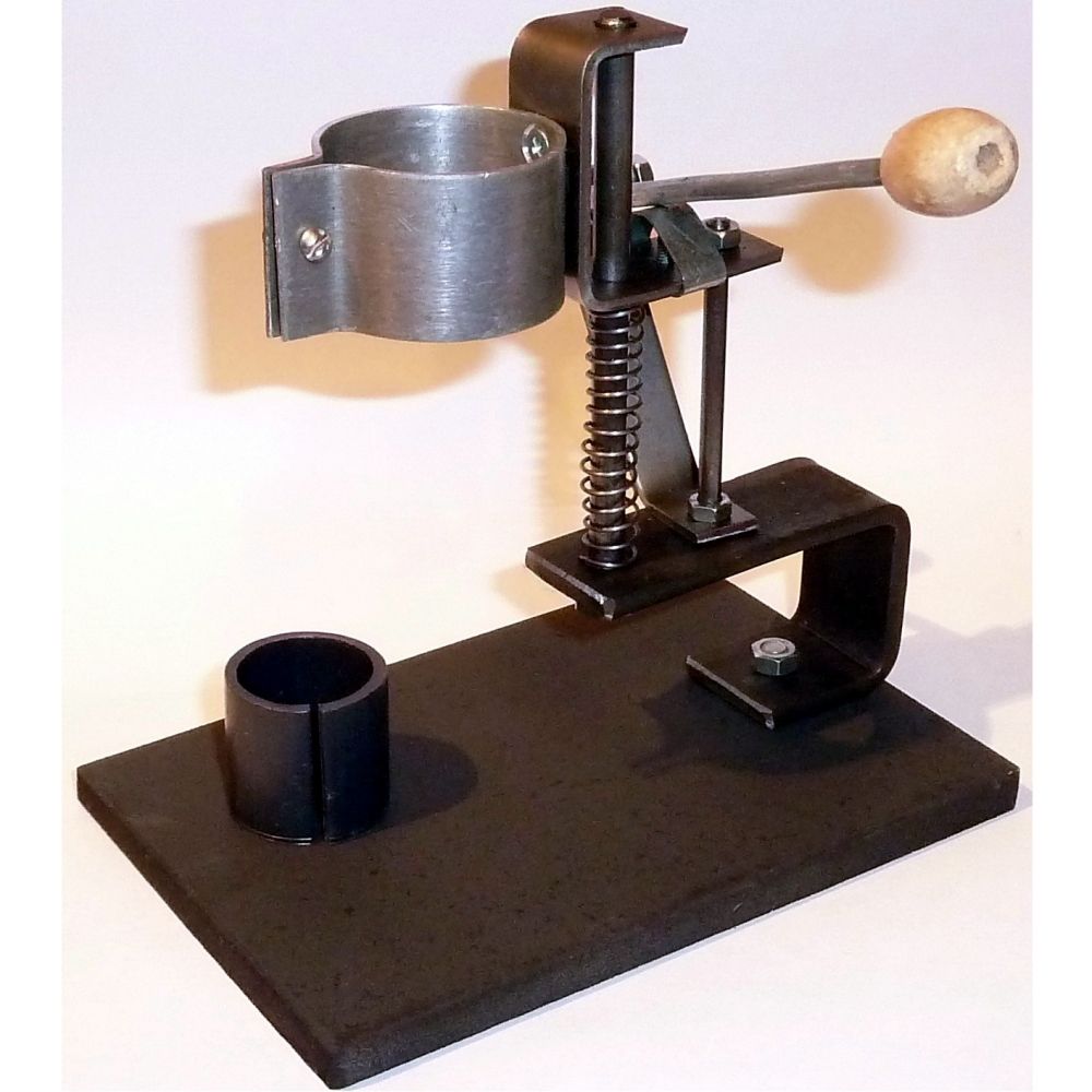 Основные этапы работВ качестве основания самоделки используется металлический диск. По центру диска сверлим отверстие, и вставляем стальной кругляк, на который надеваем ручку с прижимным упором.
