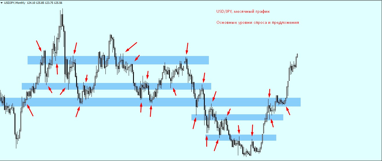 Это области с потенциальным давлением покупателей либо продавцов. Как только цена достигнет этих уровней, скорее всего, она остановится или изменит свое направление. Это позволяет нам находить точки входа на покупку или продажу.