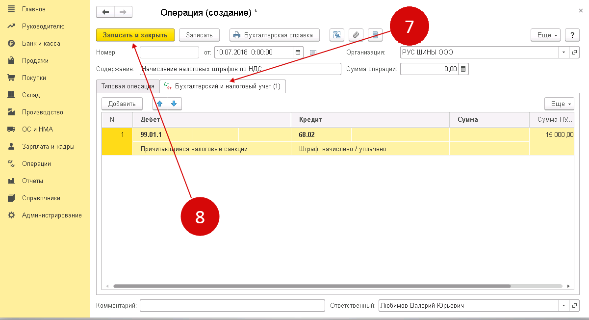Для формирования проводок создадим ручную операцию. Вводим проводку Дт 70 Кт 73.02 и указываем сумму штрафа.