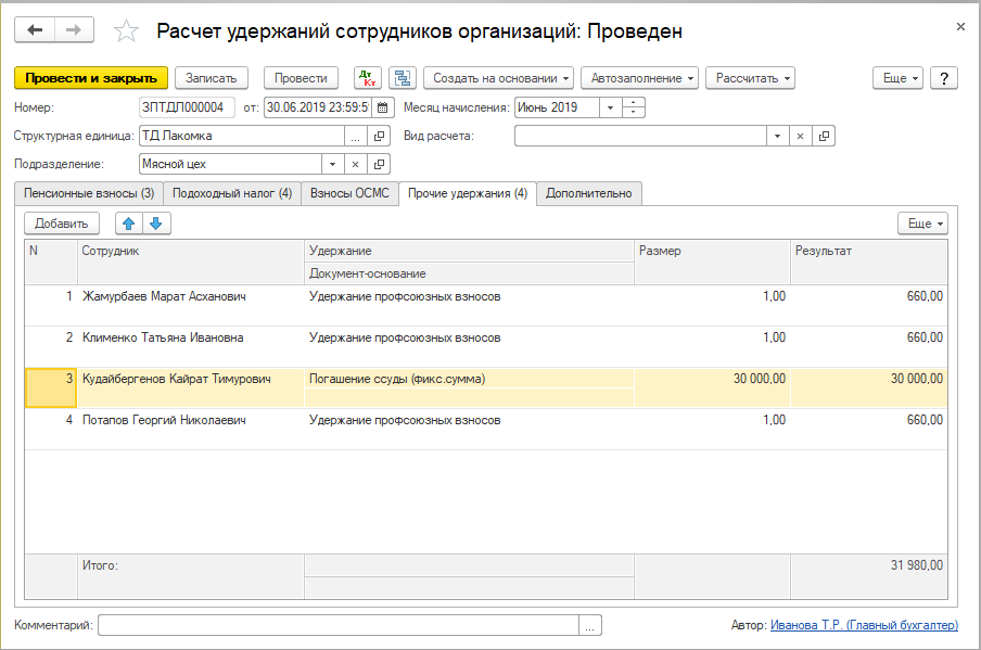 Указать в нём сотрудника, размер удерживаемой суммы и тот вид удержания, который мы создавали ранее.