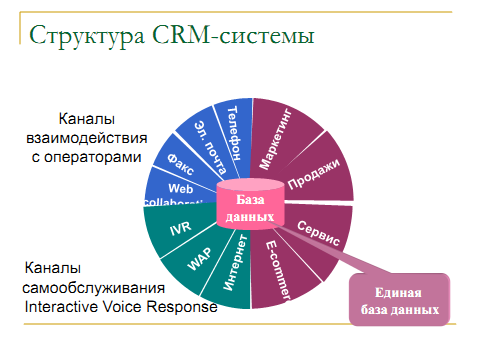 Несмотря на то, что концепция CRM существует достаточно давно, устоявшегося набора ее функциональных компонентов не существует. Считается, что такие системы должны содержать следующие элементы: