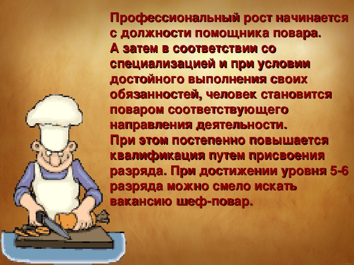 Повар – это высококвалифицированный кулинар, который работает на кухне ресторана. Многие повара имеют диплом кулинара и проходят дополнительное обучение у других опытных шеф-поваров, что впоследствии делает их весьма опытными и компетентными в своем ремесле. Повар тратит большую часть своего времени на приготовление блюд на кухне. При этом часто шеф-повара сами не готовят, а управляют командой других работников кухни, поскольку он знает, как лучше всего приготовить блюда, включая соответствующий гарнир, правильный внешний вид еды и т.д.