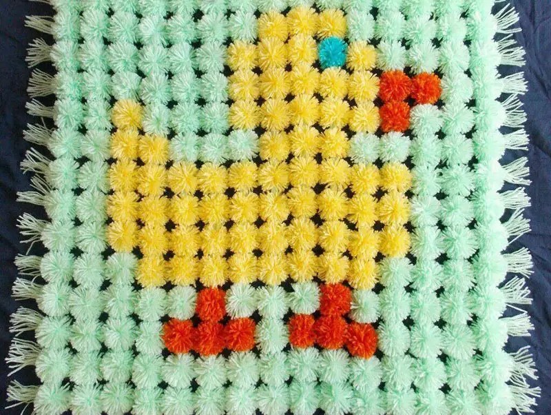 После того как все шарики будут пришиты, кончик нити завязывается узлом на изнаночной стороне. Если же в качестве основы будет использоваться обычная сетка, то в каждую дырочку следует просунуть хвостики помпонов, а затем нитку крепко завязать в узелок с соседним шариком.