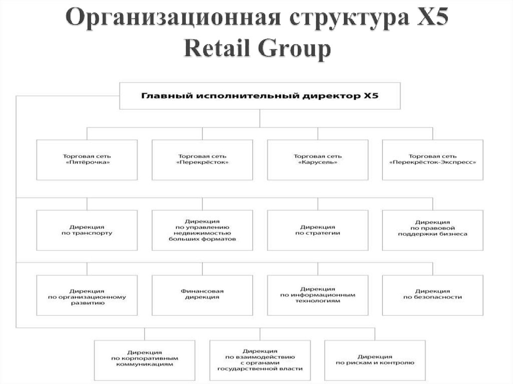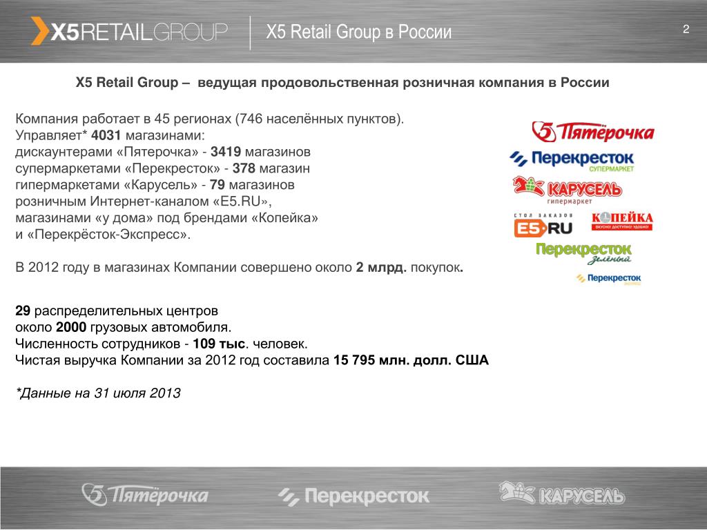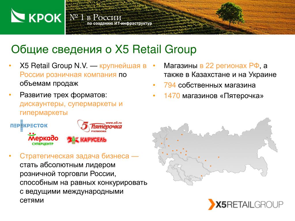 X5 Group («Х5») — одна из ведущих российских мультиформатных продуктовых розничных компаний. Компания управляет магазинами нескольких торговых сетей: магазинами «у дома» под брендом «Пятёрочка», супермаркетами под брендом «Перекрёсток» и жесткими дискаунтерами под брендом «Чижик».