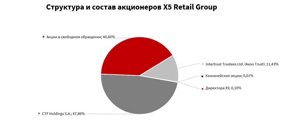 Крупнейший пакет X5 (47,86%) у совладельцев «Альфа-Групп» — Михаила Фридмана (21,9%), Германа Хана и Алексея Кузьмичёва. 14,43% принадлежит основателям «Пятёрочки», 0,06% — директорам X5. Казначейские акции — 0,02%, акции в свободном обращении — 37,64%.