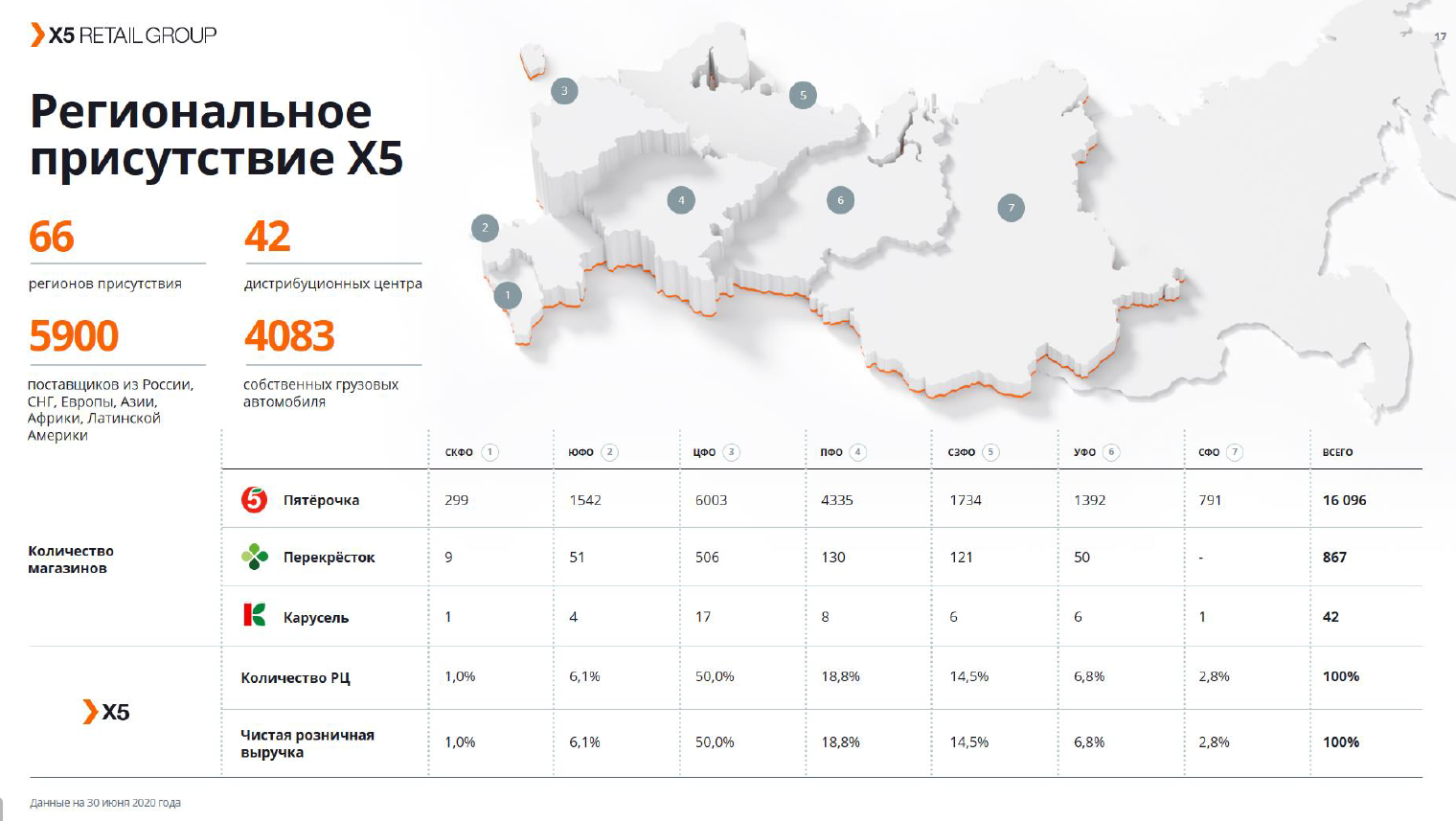 Сеть включает в себя 18 865 магазинов «Пятёрочка», 972 супермаркетов «Перекрёсток» и 316 «жёстких» дискаунтеров «Чижик».