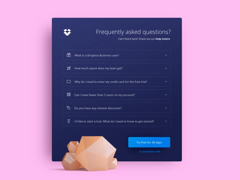 Dropbox ставит все галочки на своей подробной, но несложной странице часто задаваемых вопросов. На странице есть четкое, жирное окно поиска, которое побуждает посетителей использовать инструмент вместо прокрутки для своего вопроса. В верхней части страницы есть ссылки на популярные страницы часто задаваемых вопросов — вероятно, самые популярные или самые новые. Ниже приведено множество тем с краткими описаниями, которые помогут читателям быстро найти ответы.