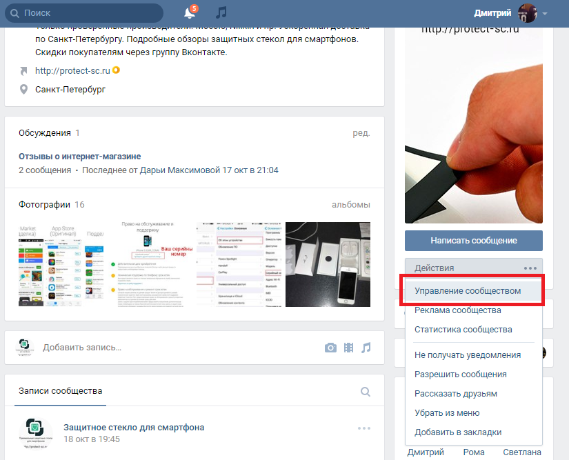 Настройки в разделе «Управление»Перейдем к этапам оформления групп ВКонтакте.