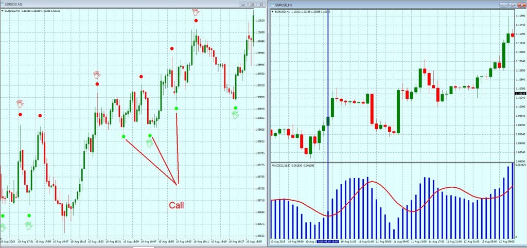 Так как используются скользящие средние, то для такой торговли бинарными опционами требуется участок явного тренда, на который указывает «длинная» линия индикатора EMA. Точкой входа будет индикаторы для бинарных опционов 60 секунд пересечение средних с соответствующим положением гистограммы MACD. Для торговли бинарными опционами используется комбинация из двух осцилляторов, подтверждающих сигналы друг друга.