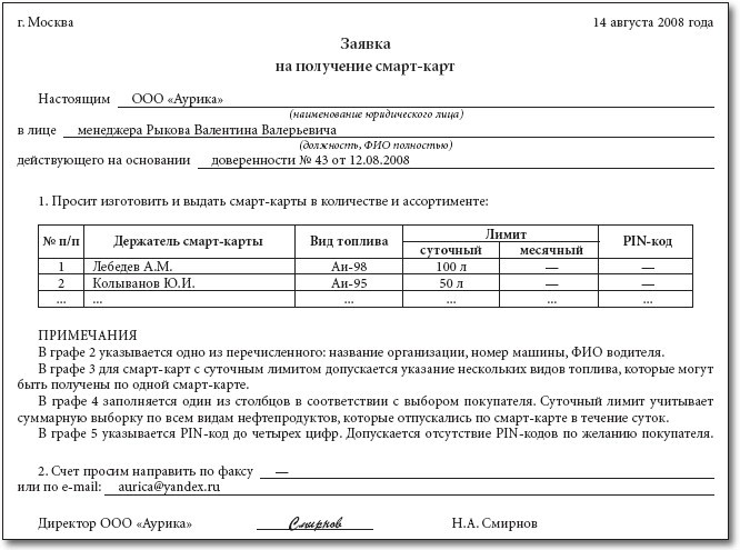 6. Включите в договор Заявку на карты, спецификацию с указанием количества нефтепродуктов и фиксированной цены за 1 литр. (Как правило заявка и спецификация оформляется в виде приложений к договору)