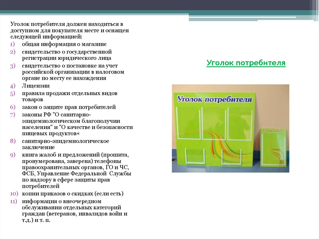 Что должно быть в уголке потребителя — п. 1, 2 ст. 8, п. 3 ст. 9 закона о защите прав потребителей