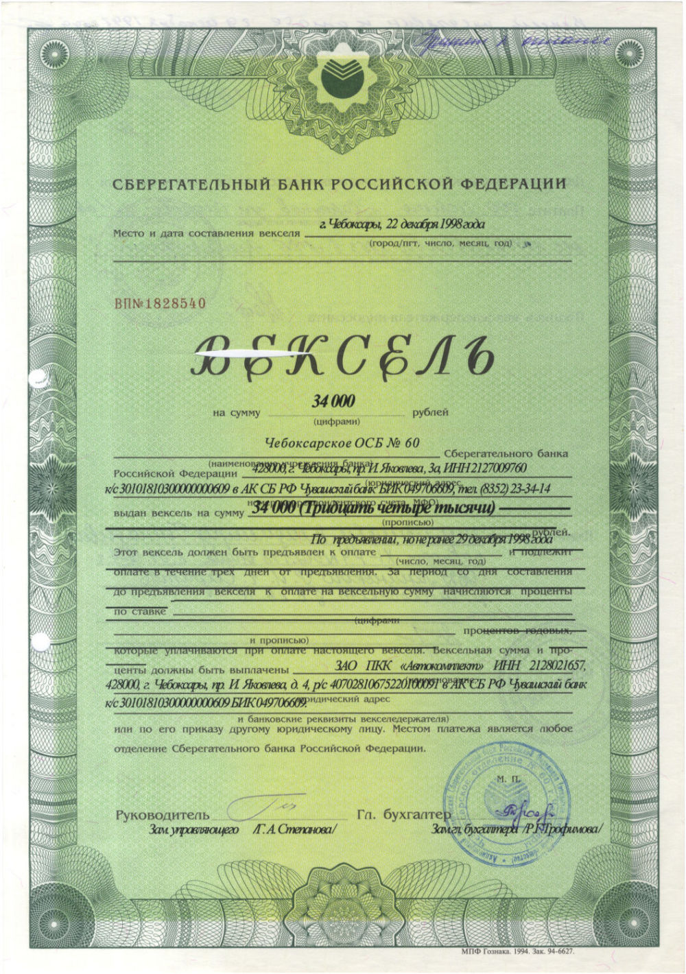Бланк-образец простого векселя Сбербанка, 2022 год