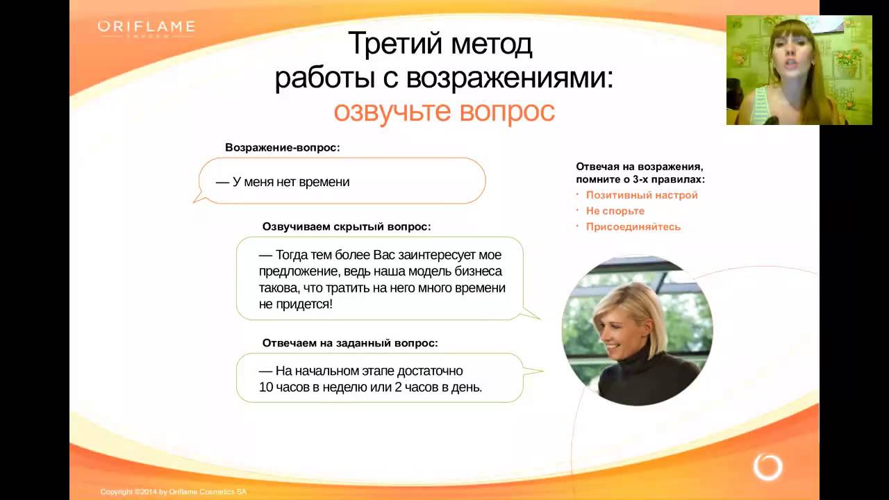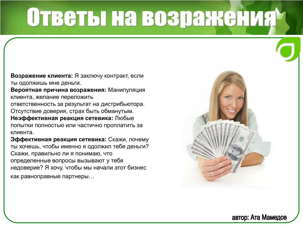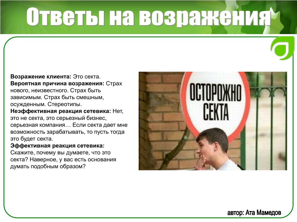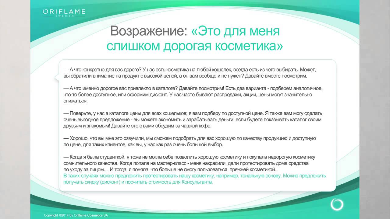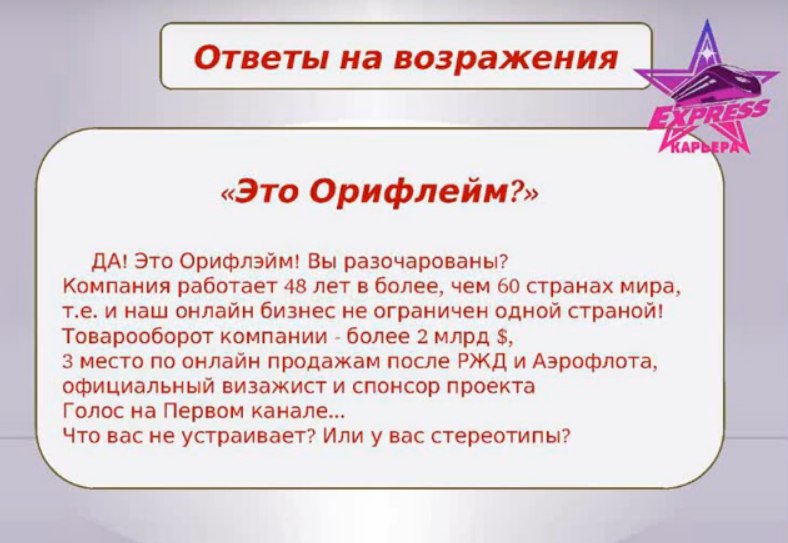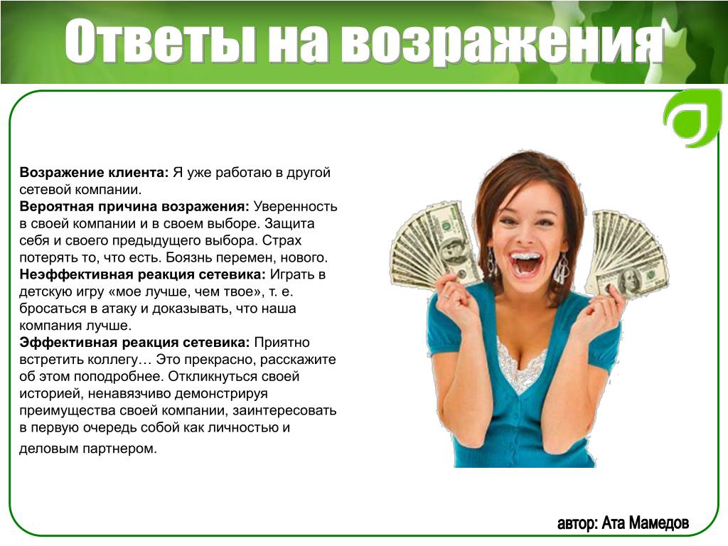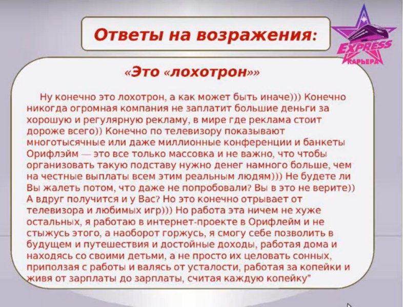 Возражение надеюсь, ни орифлейм? Ответ: Насть, а что смущает в сотрудничестве с этой компанией? Мы сотрудничаем с ней. Какая разница какой интернет-магазин раскручивать, если вам сама по себе интересна, как вы ответили, эта деятельность? Компания платит не СМИ, не агентствам рекламным, а нам за раскрутку их сайта. Продавать не надо бегать с каталогом, закупаться не надо, вкладываться не надо. Продукт удобный для работы. не таблетки китайские, не порошки для похудания. Проходите обучение и начинайте работу по той же схеме, по которой уже работают люди, зарабатывая от 30000 и выше. Так в чем именно у вас сомнения или стереотипы, связанные с этой компанией? работала я там ни раз, что-то Далее я ответила о не понравилось, а вы вот своем заработке и о сути бизнеса сколько получаете Ответ кандидата: давай попробуем