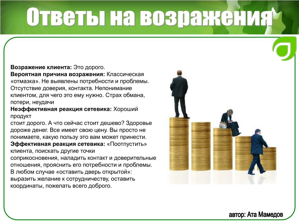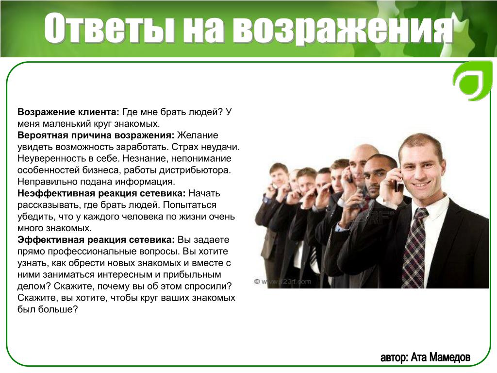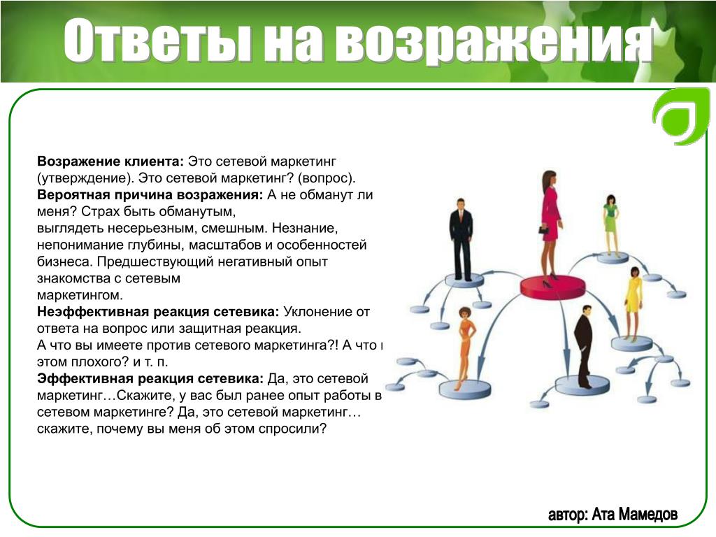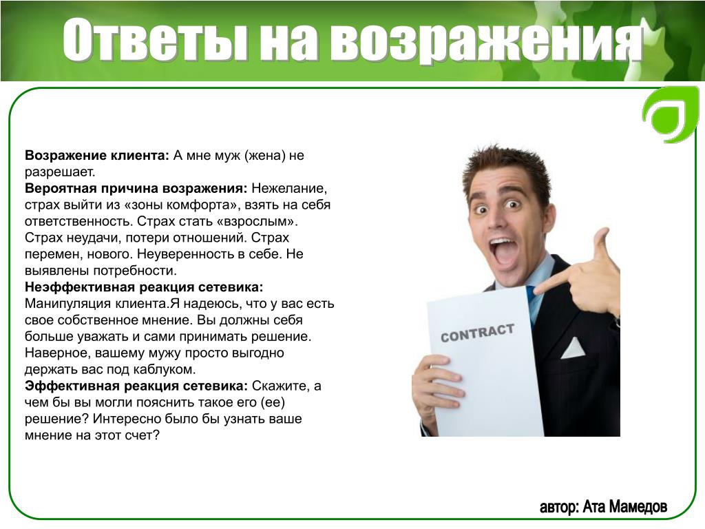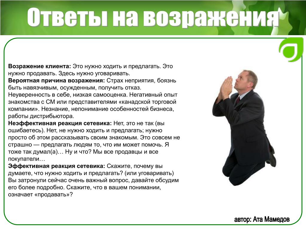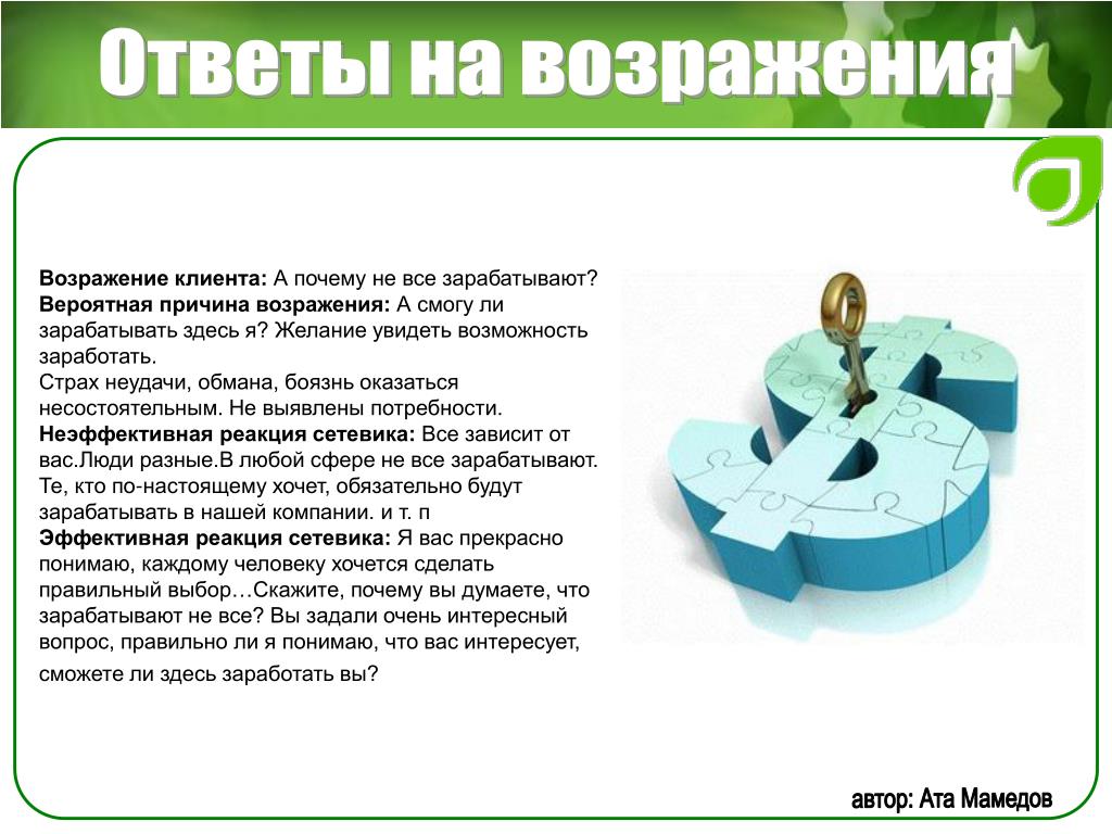 Возражение надеюсь, ни орифлейм? Ответ: Насть, а что смущает в сотрудничестве с этой компанией? Мы сотрудничаем с ней. Какая разница какой интернет-магазин раскручивать, если вам сама по себе интересна, как вы ответили, эта деятельность? Компания платит не СМИ, не агентствам рекламным, а нам за раскрутку их сайта. Продавать не надо бегать с каталогом, закупаться не надо, вкладываться не надо. Продукт удобный для работы. не таблетки китайские, не порошки для похудания. Проходите обучение и начинайте работу по той же схеме, по которой уже работают люди, зарабатывая от 30000 и выше. Так в чем именно у вас сомнения или стереотипы, связанные с этой компанией? работала я там ни раз, что-то Далее я ответила о не понравилось, а вы вот своем заработке и о сути бизнеса сколько получаете Ответ кандидата: давай попробуем