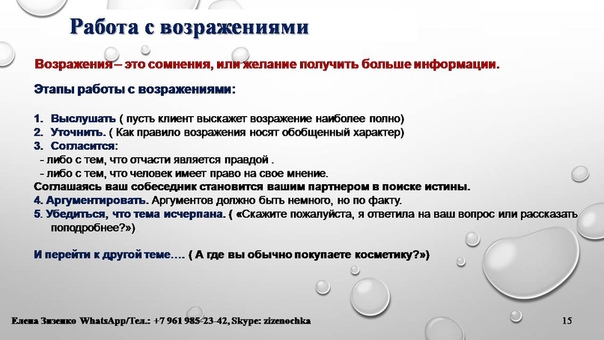 Дополнительные советы по выявлению и устранению возражений при продажах Предупреждать распространенные возражения при продажах и решать их по телефонуБудьте в курсе основных возражений покупателей по поводу ваших продуктов и отвечайте на них напрямую, даже если вы не встречаетесь лицом к лицу.Например, если вы рассылаете информационные бюллетени и рекламные акции, вы можете рассказать о проблемах, которые поднимают клиенты, и обосновать, почему они должны рассмотреть ваши продукты.