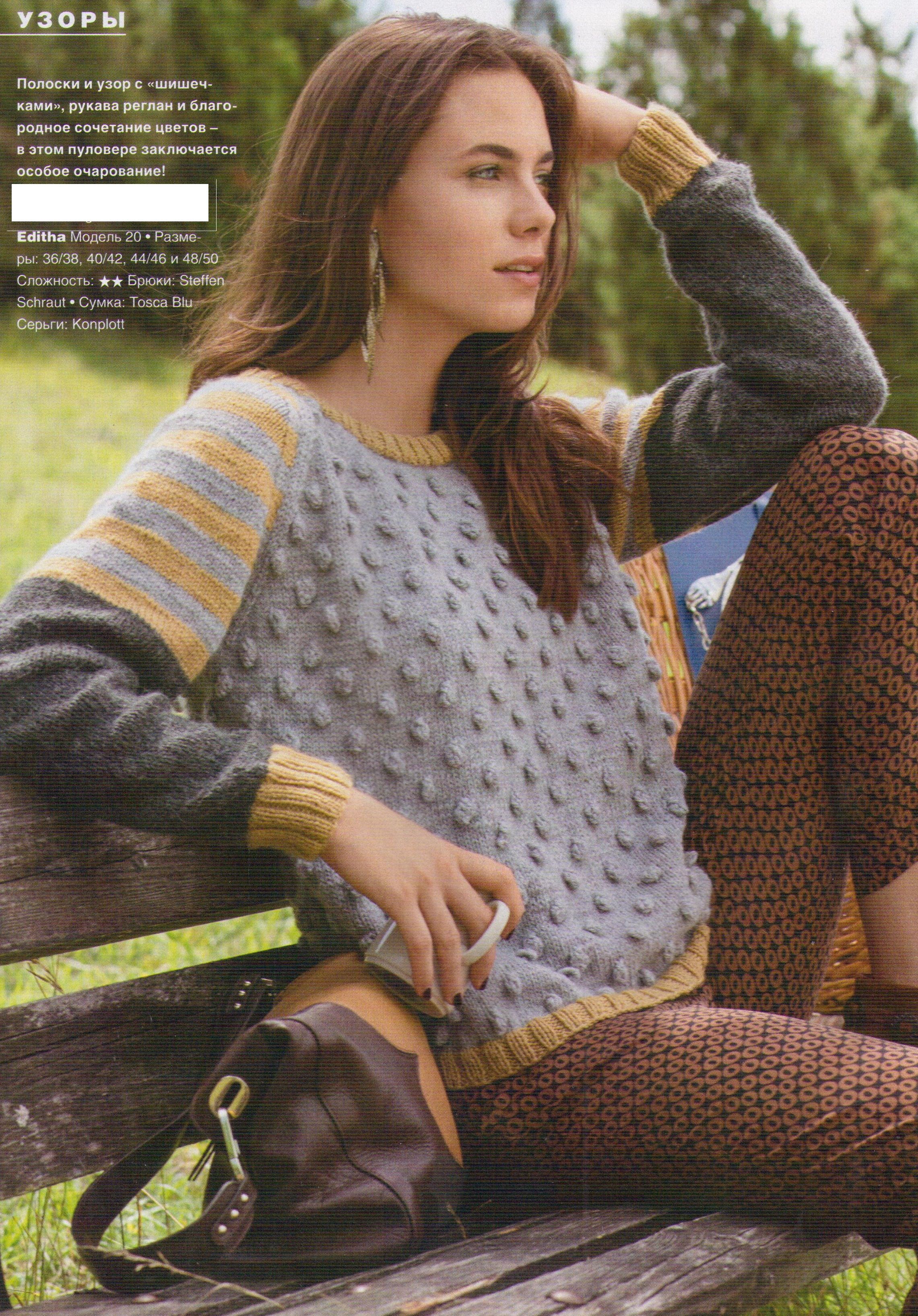 Используемые материалы: 5 мотков пряжи (92% акрил, 8% фибра, 100 г./250 м.), спицы № 4 обычные и круговые, дополнительная спица для кос.