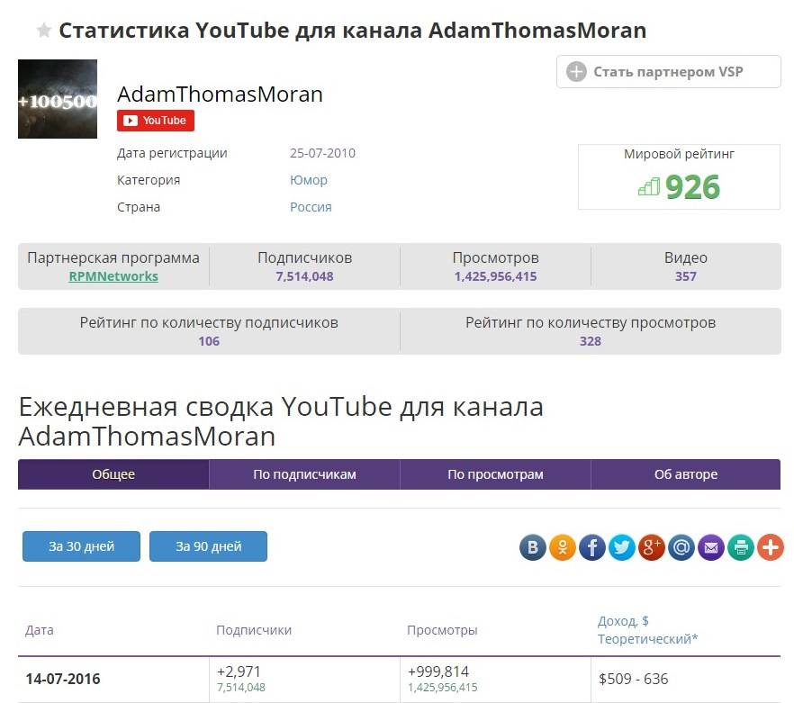 Сегодня это приблизительно 1700$, то есть стоимость тысячи просмотров — 1,7$. Если посчитать по этому курсу, то, например, клип Адель «Hello», набравший 2,8 млрд просмотров, принес артисту выплату в 4 760 000$. Но это без учета отчислений лейблу, дистрибьютору, юристам и другим помощникам. В России цена за тысячу просмотров может варьироваться от 0,25 до 4$, в среднем это будет 1$, то есть за миллион просмотров артист получает тысячу долларов. Доходы с YouTube можно проверить с помощью сервиса SocialBlade, который показывает аналитику каналов и их примерный доход. Откуда берутся эти деньги? Их приносят на YouTube рекламодатели.