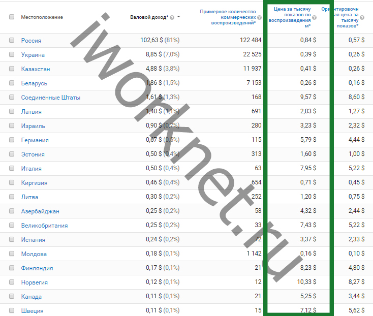 За показ рекламы от 0,25$ до 15$ за 1 000 просмотров. Заработок сильно зависит от тематики и от страны, в которой смотрят видео. И если CPM за преролл в США будет начинаться от 6$, то CPM на музыкальном канале в России в среднем 0,87 $.