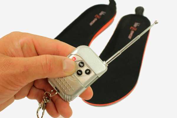 1. Беспроводные стельки с подогревом. Конструкция устройства подкупает простотой, практичностью и отсутствием проводов и других внешних элементов. Стелька оснащена пультом, что дает возможность дистанционно управлять устройством. Оно оснащено небольшим аккумулятором.