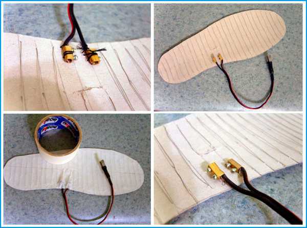 Провода МГТФ пришивайте к стельке сбоку, потом натягивайте термоусадку, концы припаять к штекеру. Устройство готово! Теперь займемся батарейным отсеком. Одну ячейку выделите под переключатель и розетку minijack. Перепаять и все залить горячим клеем.С тыльной стороны просверлить несколько отверстий, для липучек. Все самодельные стельки готовы.