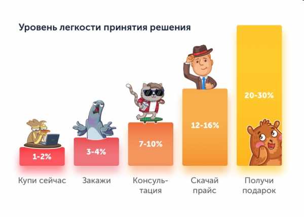 Основные инструменты визуализации — это картинки, инфографика и видео. Действие картинки вы только что оценили, наглядно представив воображение с помощью Спанч Боба. Инфографика — более продвинутый уровень. Вот, например, нам нужно объяснить, как слова на кнопке заказа влияют на уровень легкости принятия решения клиентом. Объяснить словами то, что происходит на картинке ниже, можно, но это займет здоровенный абзац. Тут же все просто: если напишешь “купи сейчас” — клиент будет долго сомневаться, а предложишь подарок — согласится нажать кнопку с легкостью.