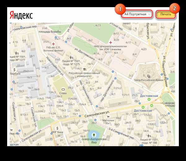 После этого откроется страница в новой вкладке, где вам останется выделить место на карте, выбрать ориентацию, в которой нужна картинка, и нажать «Печать».