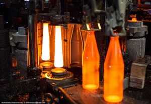 Готовая стекломасса из печи попадается в линию стекла, из которой она вытекает в форме колбасы и нарезается резаком на цилиндрические капли, одна такая капля это будущая бутылка или банка. Капля направляется в так называемый черпак, который направляет их в формовочную машину. Она работает следующим методом: держатели берут каплю за край и держат в висячем положении, вся нижняя часть капли закрывается с двух сторон нужной формой, будь то банка или бутылка, на форме также могут быть определенные узоры. После того как форма закрылась держатель отодвигается и в каплю вставляется устройство для выдувки. Оно, как воздушный шарик, раздувает каплю изнутри сжатым воздухом и масса приобретает нужную форму. Излишки расплавленного стекла уходят в первоначальную форму.