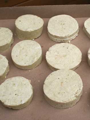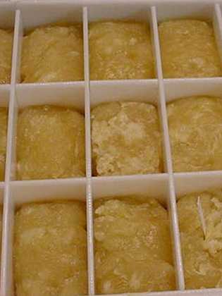 - Переложите смесь в формочки (распределять нужно быстро, пока она не застыла), оставьте в теплом сухом месте для естественного застывания. Срок окончательного созревания домашнего мыла по этому рецепту — 2-3 недели, в зависимости от размера форм.