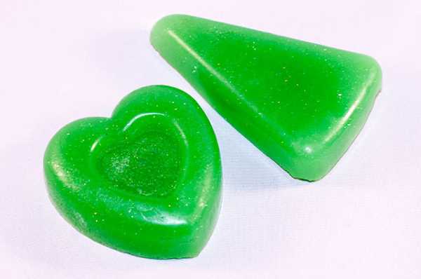 Подкрасив мыльную основу для ёлочки в зеленый цвет, получают креативный подарок к Новому году. Использовав жидкое детское мыло, не раздражающее глаза с добавлением ромашкового отвара, миндального масла, можно быть уверенным, что ребенок с удовольствием будет использовать ёлочку для гигиенических процедур.