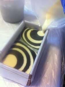 Выливают в формочку до половины темную массу и через 10 минут цветную смесь. Сбрызгивают спиртом и выдерживают мыло из обмылков до готовности.