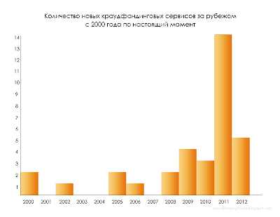FundedByMe — шведский краудфандинговый сервис для творческих проектов, запущен в 2011 году. Wesym, micromecenat — японский краудфандинговые сервисы для творческих проектов, появившиеся тоже в 2011 году. Еще японский краудфандинг, правда, сайты на японском: camp-fire (2012), readyfor (2011), motion-gallery (2012). Итальянские eppela (2012), starteed (2011) и boomstarter (2011) предназначены для творческих и благотворительных проектов. Еще итальянские краудфандинговые сервисы — сайты только на итальянском – buonacausa (2010), shinynote (2010), produzionidalbasso (2005). Сервисы biggerhub и chipin открыты, но еще пока не набрали обороты, тоже европейские и оба запущены в 2012. Сервис kapipal (2009) позволяет собирать средства на любые нужды, даже на свадьбу друзей. Испанские сервисы kifund (2011) — исключительно для фильмов и goteo (2011) тоже выглядят довольно интересно, но у них нет английской версии. А на графике ниже показан рост появления краудфандинговых проектов в мире, который говорит сам за себя. Мне думается, в декабре 2012 последний столбик станет самым высоким.
