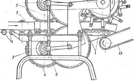 Брусок мыла, выходящий из шнекового пресса, двигаясь между накатывающими барабанами 3, вращает их, а вместе с ними и барабан режущего механизма. Барабаны связаны между собой цепной передачей 12. Отрезанные куски отводятся транспортером 13 на упаковочный стол. Вес куска регулируют изменением высоты бруска, выходящего из шнекового пресса при помощи выходного калибра. ■